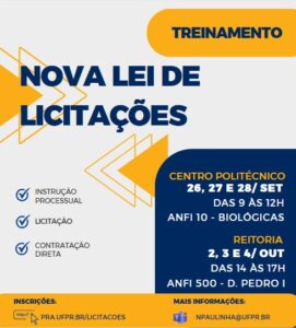 A Coordenadoria de Licitações e Contratações da UFPR promoverá treinamento para instrução de processos pela Nova Lei de Licitações, contemplando os processos de licitação e de contratação direta.