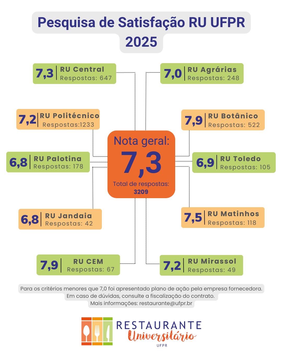 Entre os dias 26/05/2025 e 15/06/2025 foi aplicada a Pesquisa de Satisfação 2025 dos Restaurantes Universitários, na qual foram abordadas questões relacionadas à percepção de satisfação dos usuários quanto aos serviços prestados.